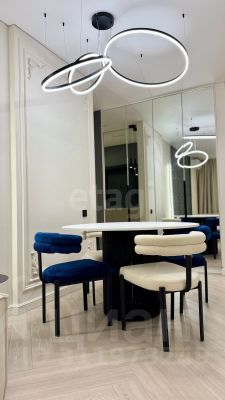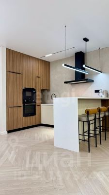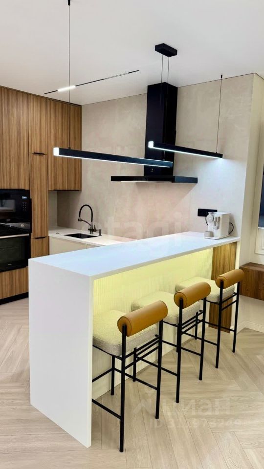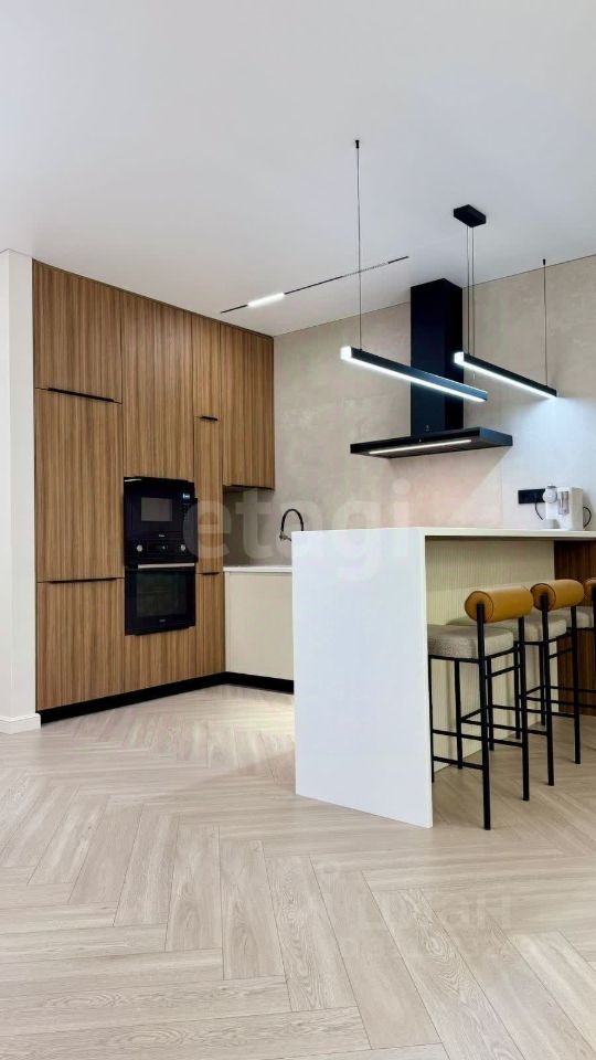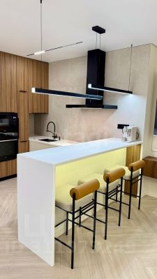 Кухня выполнена на заказ с крашеными фасадами и роскошной каменной акриловой столешницей. Есть три сплит-системы, стиральная машина с функцией сушки, индукционная плита, микроволновая печь, духовой шкаф и посудомоечная машину от бренда Haier.