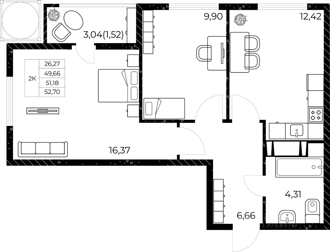 Общая площадь52,7 м²