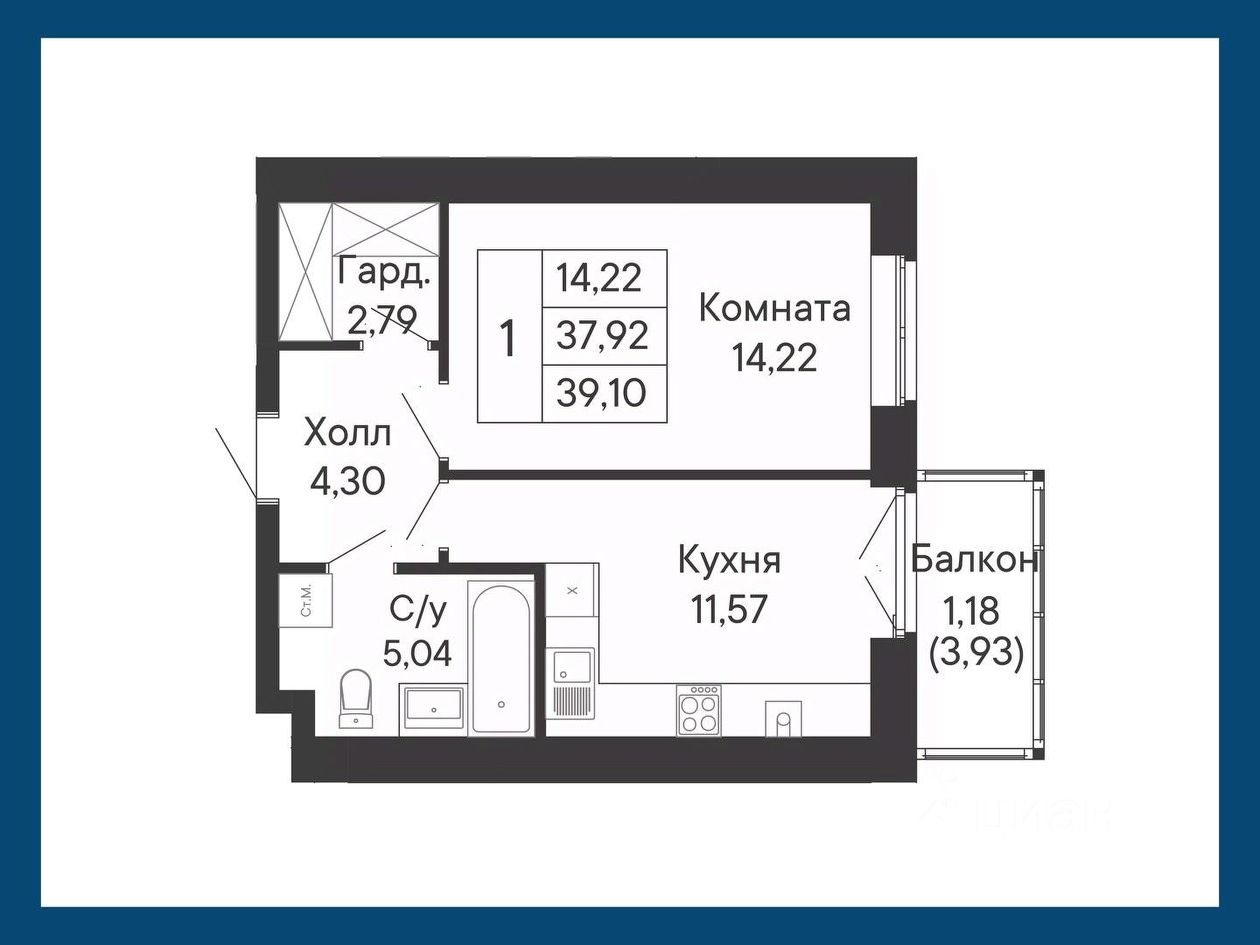 Удобное планировочное решение этой однокомнатной квартиры включает в себя балкон на кухне и гардероб в холле.