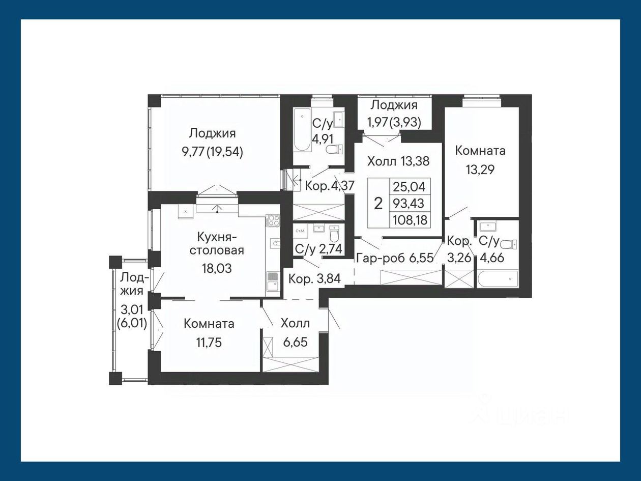 Большая двухкомнатная квартира уникального формата: с окнами в ванной комнате и мастер-спальней. Кухня-столовая и гостиная смежные, обе с выходами на отдельные лоджии.