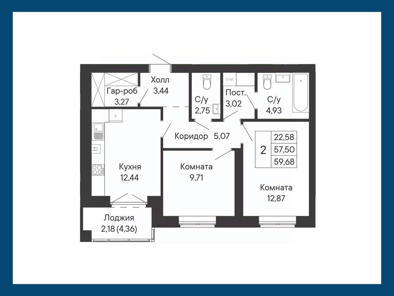 В данном решении представлена просторная и удобная планировка: двухкомнатная квартира с гардеробом в холле, смежными ванной и постирочной, гостевым санузлом и лоджией в большой кухне.