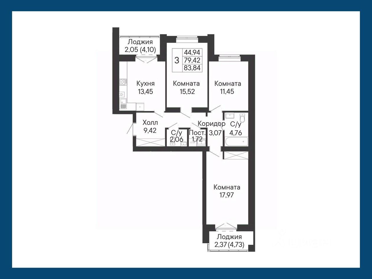 Данное планировочное решение светлая трехкомнатная квартира с двумя лоджиями, на кухне и в спальне. Предусмотрена постирочная.