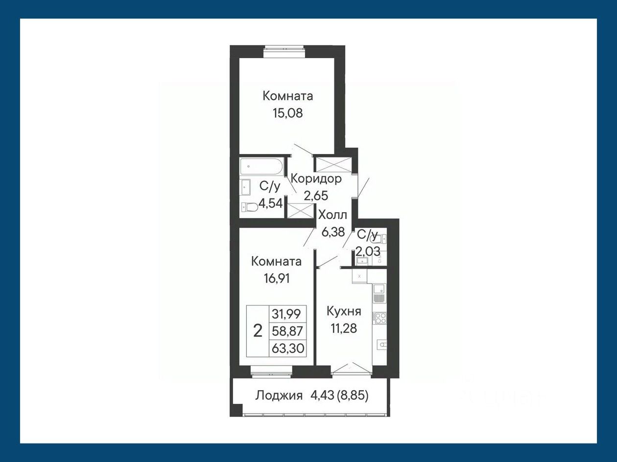 Данное планировочное решение представляет собой двухкомнатную квартиру с выходом на большую лоджию из кухни.
