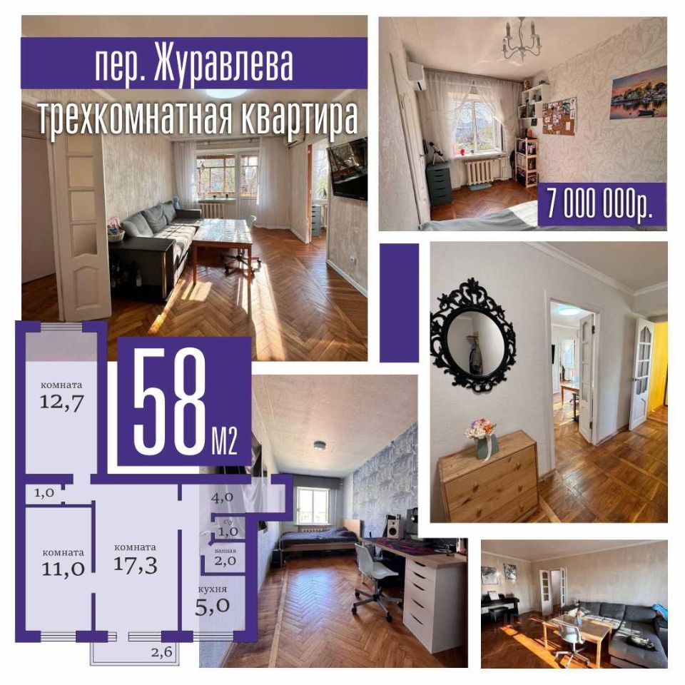 Продается уютная 3-комнатная квартира в самом сердце г. Ростова-на-Дону, переулок Журавлева. Окна выходят на две стороны дома, сан. узел раздельный, есть кладовая, что несомненно удобно, утепленная застекленная лоджия, на полу паркет ( коридор - 7 м2; 1-я комната - 17,3 м2; 2-я комната - 10,5 м2; 3-я комната - 12,7 м2; кухня - 5 м2; ванна - 1,9 м2; туалет - 1 м2, вместительная кладовая; застекленная лоджия) - идеальный выбор для тех, кто ценит комфорт, удобство и атмосферу городской жизни. Состояние квартиры хорошее, с возможностью немедленного заселения, что позволит Вам создать уютное гнездышко для Вашей семьи. Дом кирпичный, теплый, все необходимые работ по его техническому состоянию проведены. Дом находится в прекрасной локации: до ул. Большой Садовой - 5 мин, рядом ул. Красноармейская, ул. Пушкинская, в доступности Театральная площадь, а также прогулочные зоны.