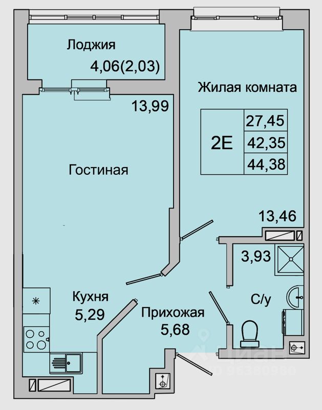 Общая площадь44,38 м²
