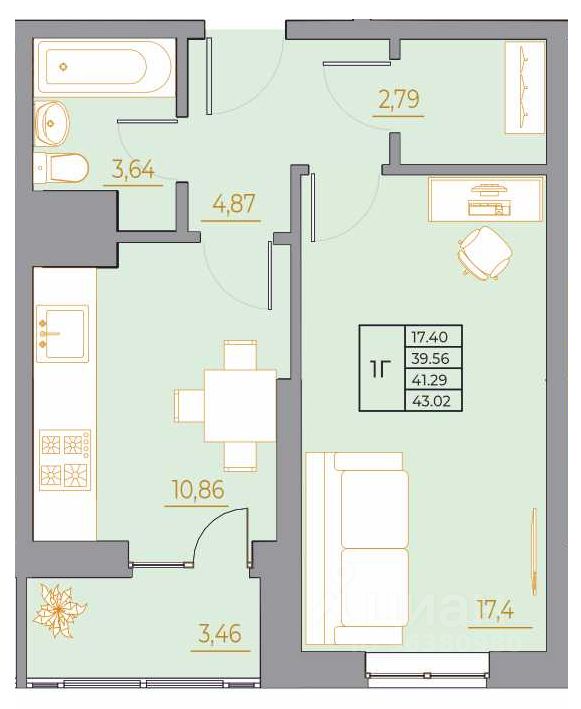 Общая площадь43,02 м²