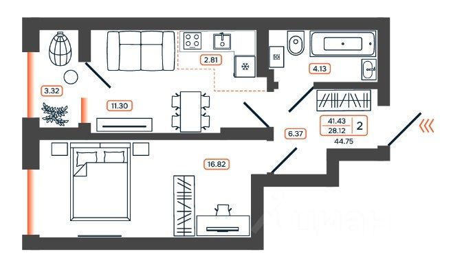 44,75 м²
