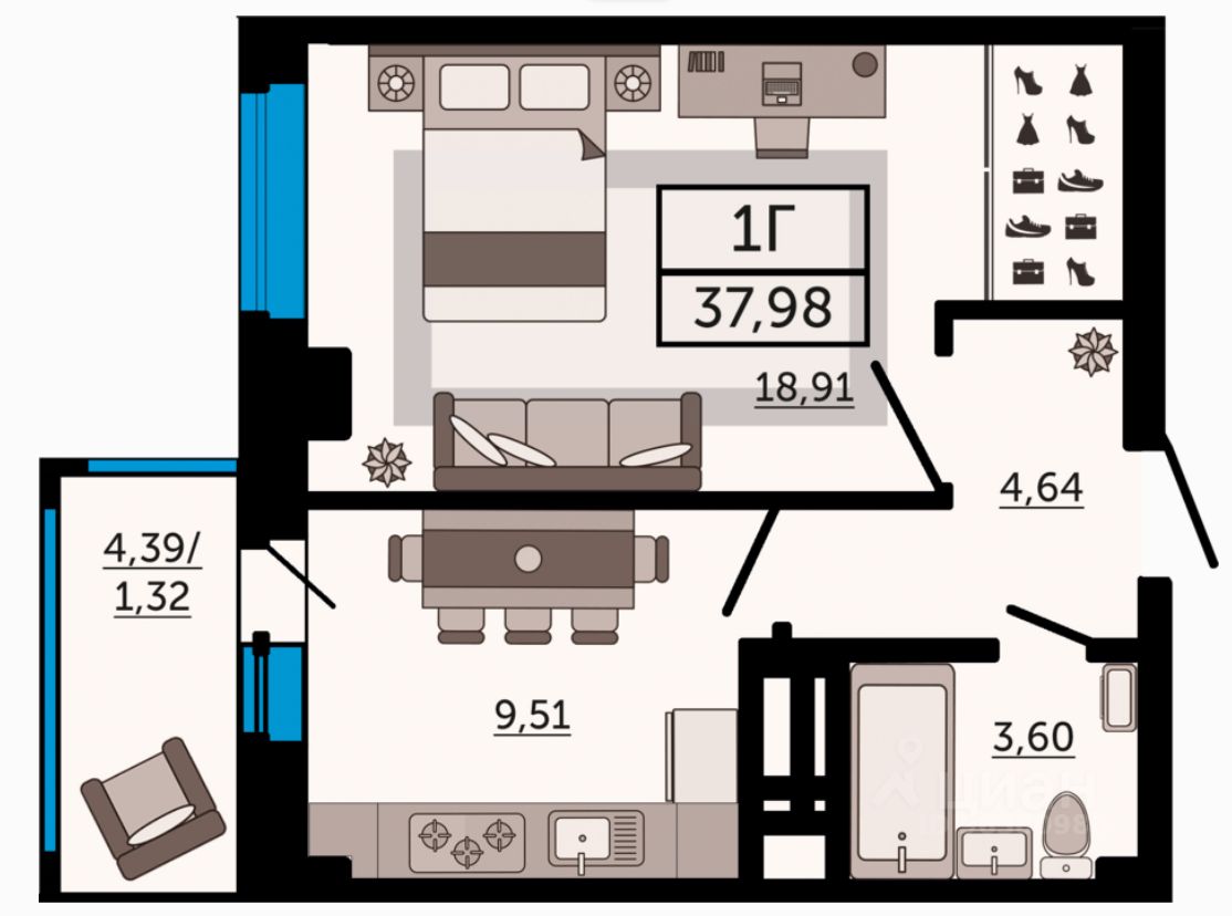 Общая площадь37,98 м²