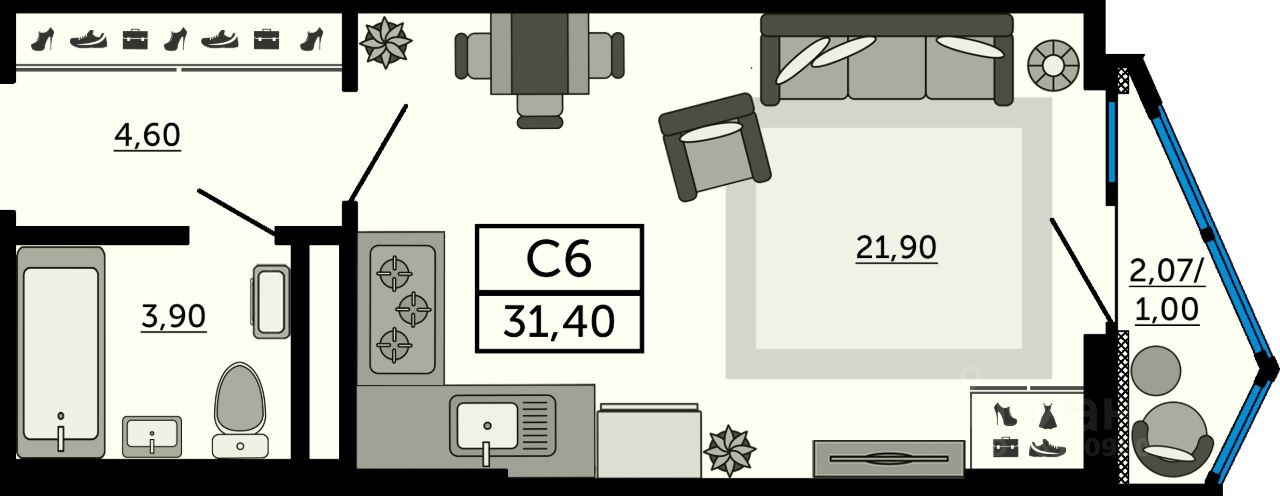 Утро всегда начинается с красивого вида из окна: сквер, набережная и река. Панорамное остекление - еще и функциональный тренд. Расширяет пространство и наполняет комнату солнечным светом.