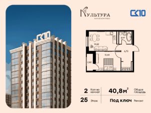 Продаётся 2-комнатная квартира в строящемся доме (Секции 2.1 - 2.2), срок сдачи: I-кв. 2027, общей площадью 40.82 кв.м., на 25 этаже. Новый жилой комплекс "Культура" от группы компаний "СК10" расположен по адресу: г. Ростов-на-Дону, по ул. Текучёва.