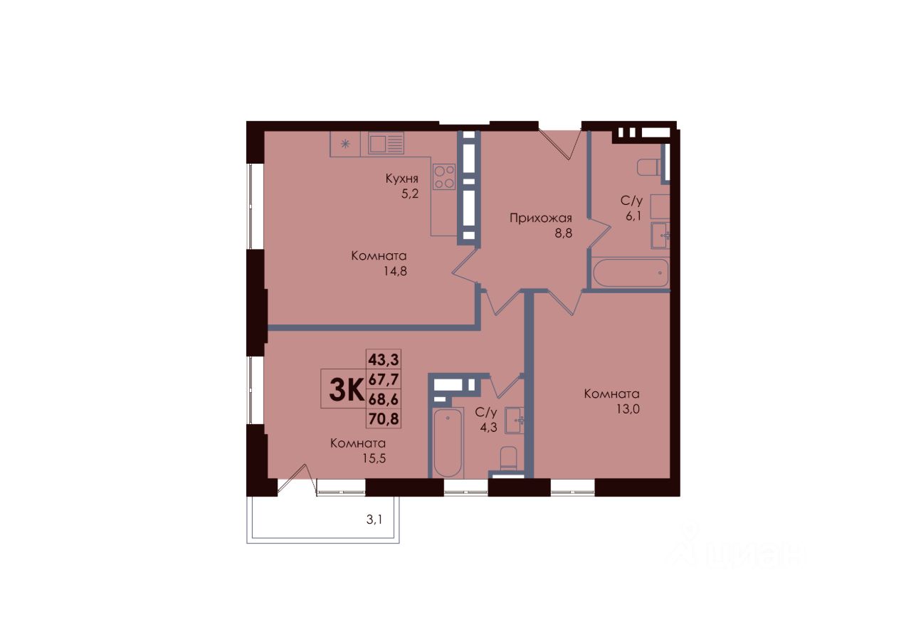 Общая площадь68,6 м²