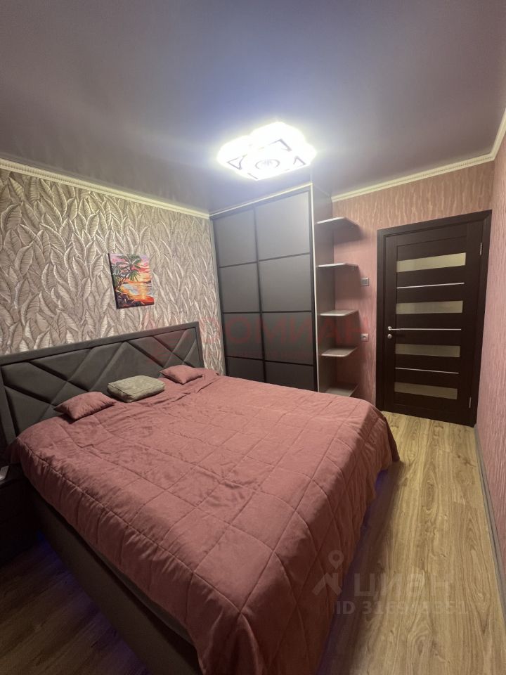 В спальной комнате большая кровать 180 см в ширину, оборудована подсветкой. Просторный шкаф-купе и прикроватная тумба.