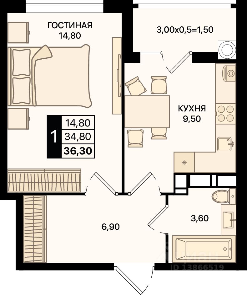 Общая площадь36,3 м²