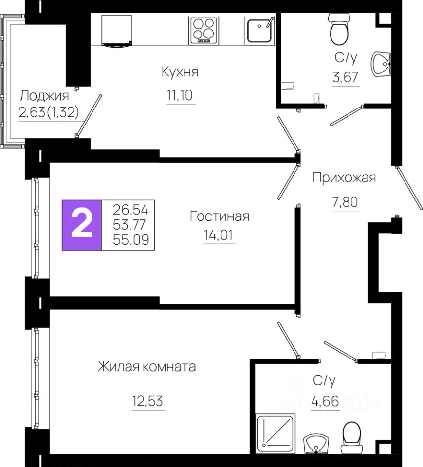 Общая площадь55,09 м²