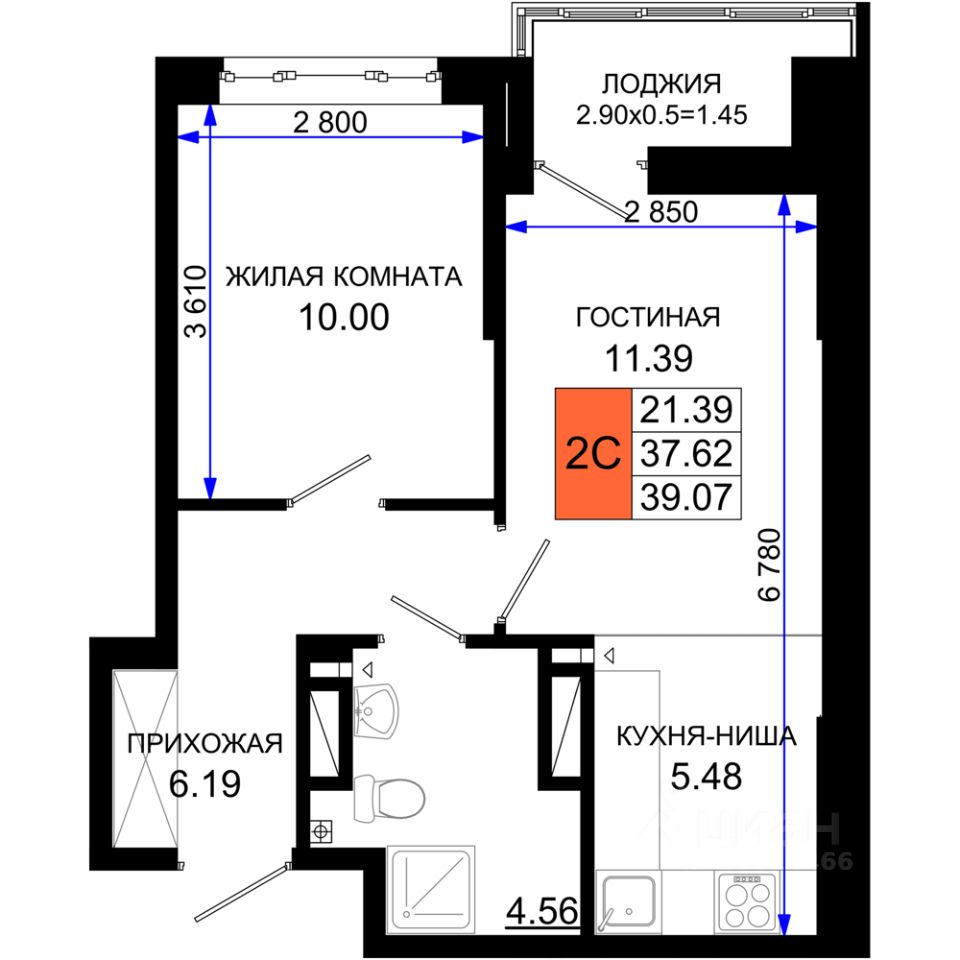 Общая площадь39,07 м²