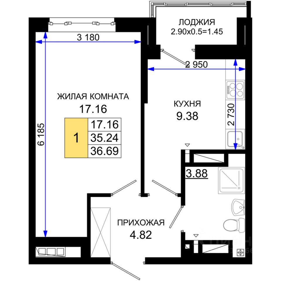 Общая площадь36,69 м²