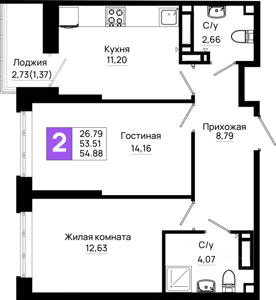 Общая площадь54,88 м²
