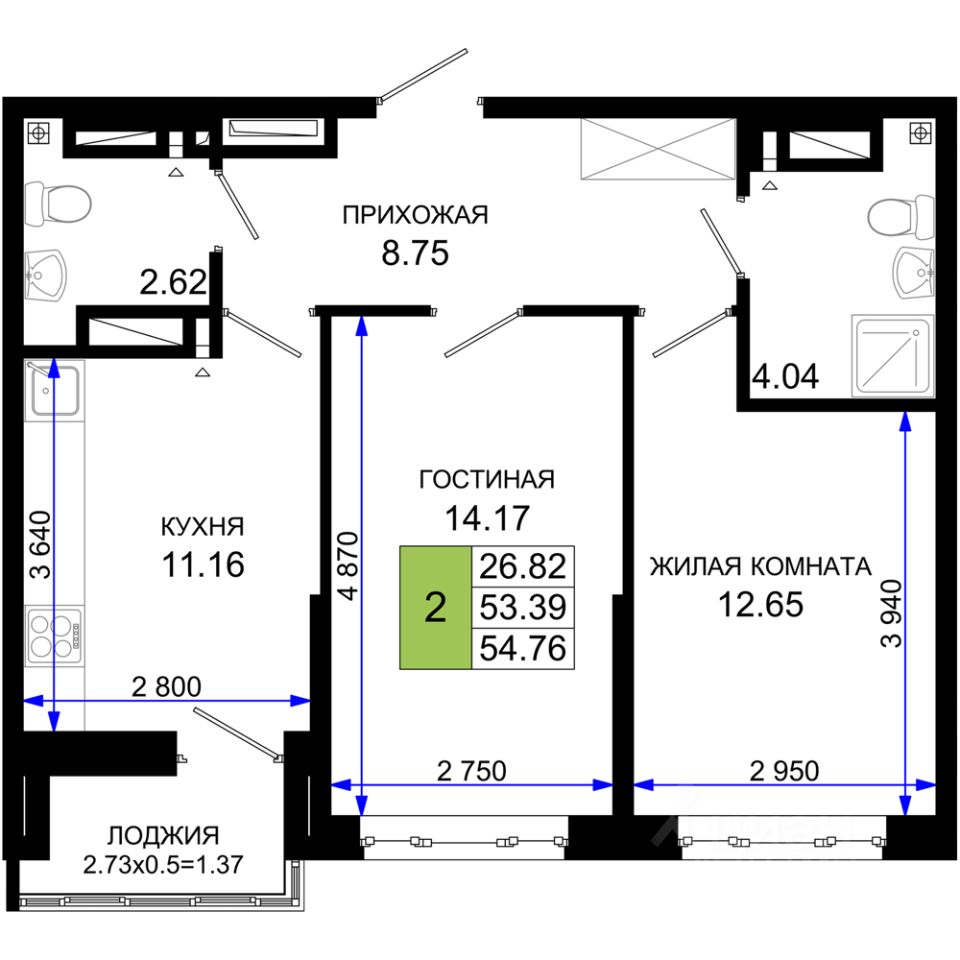 Общая площадь54,76 м²