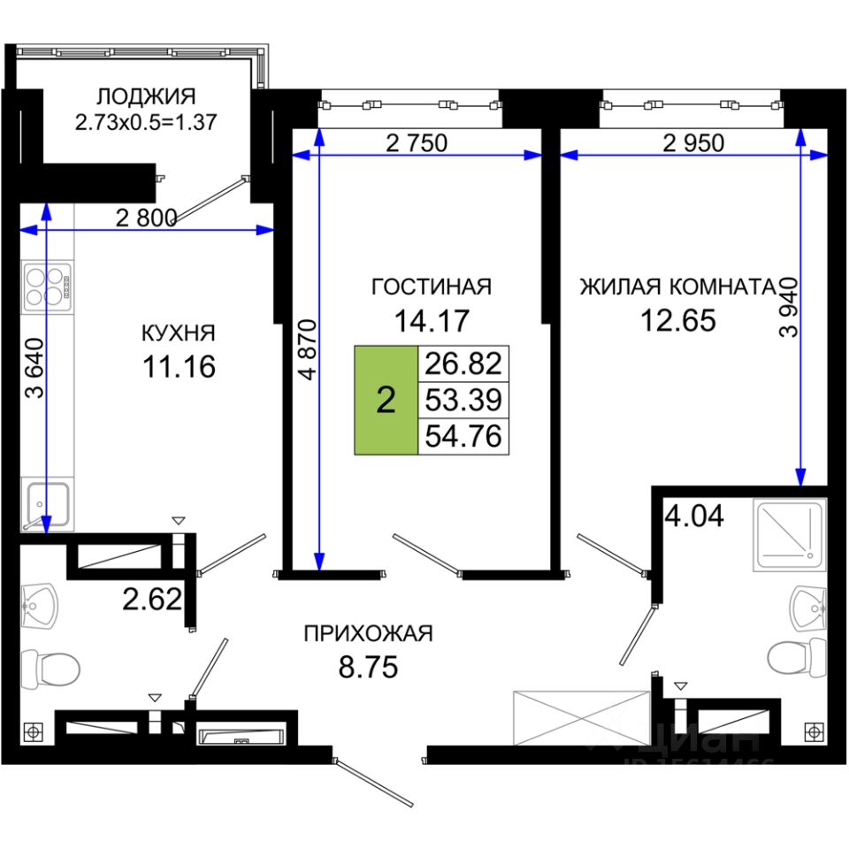 Общая площадь54,76 м²
