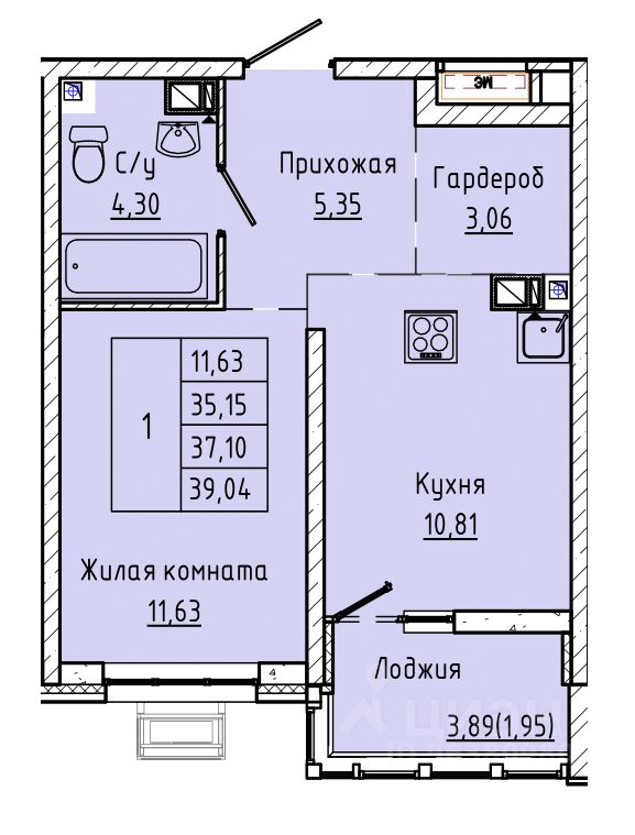 Общая площадь37,02 м²