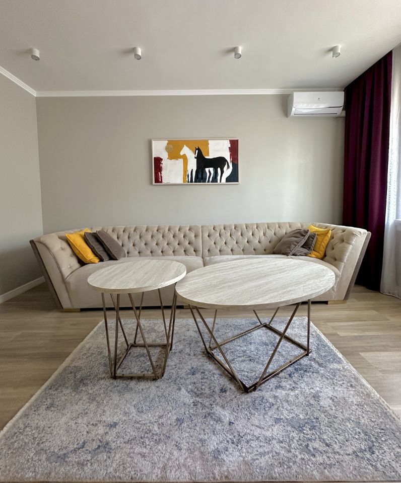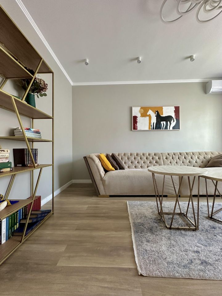 В квартире выполнен ремонт из качественных материалов. Кухня из массива дерева оснащена техникой Arisron (варочная панель, духовой шкаф, посудомоечная машина).