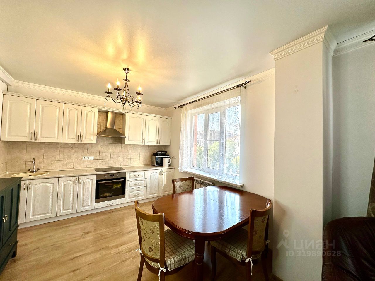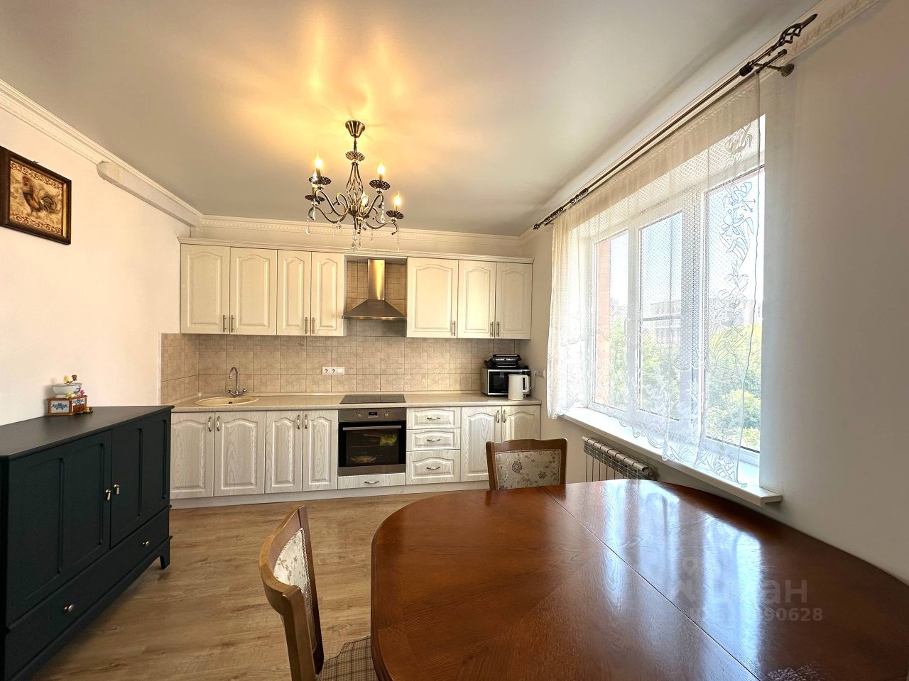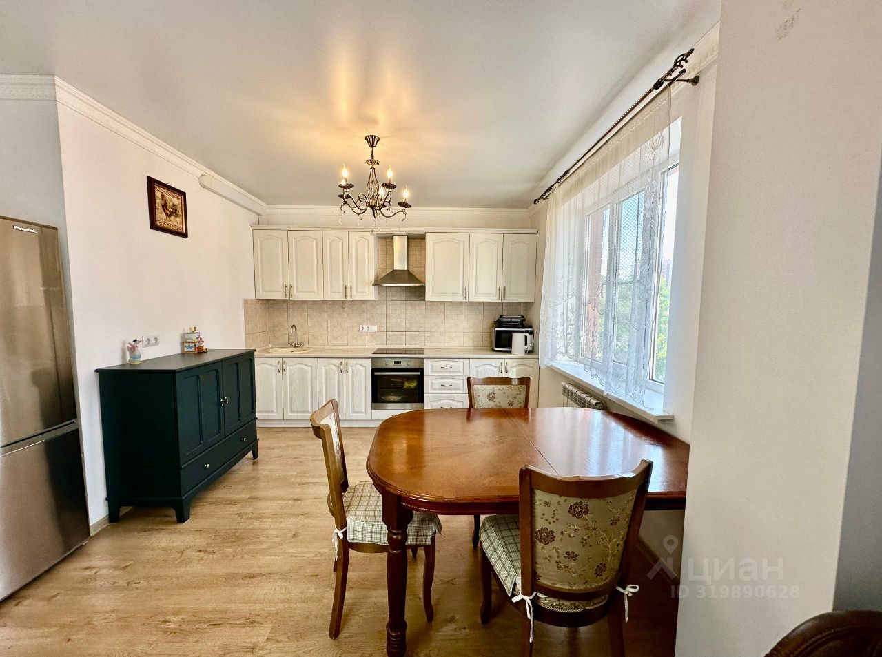 • Кухня (14 м²): белый встроенный гарнитур с золотой патиной, техника Electrolux (варочная панель, духовой шкаф), вытяжка, СВЧ, холодильник PANASONIC, обеденный стол и стулья из Малайзии.