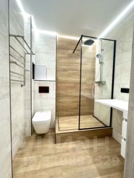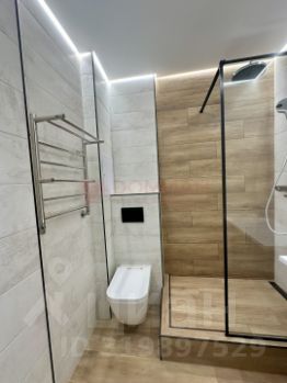 Санузел полностью отделан плиткой, установлены инсталляция, современная душевая кабинка.