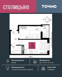 ЖК "Столицыно" — это самый масштабный проект ГК ТОЧНО в Ростовской области. На территории 42 га возводятся 18 домов переменной этажности, школа на 1300 мест, два детских сада на 600 мест, медицинский центр, парк 8,4 га и фитнес-центр с бассейном. Проект возводится по концепции "город в городе", где все необходимое для комфортной жизни будет в шаговой доступности.