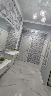 На полу в прихожую , коридор,кухню и с/у клали керамогранит 120/60 .