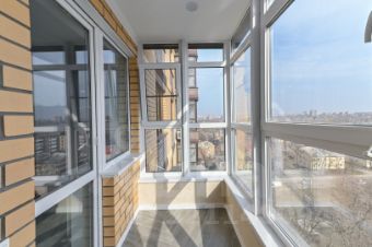 Лоджия просторная, панорамные окна, теплый пол.