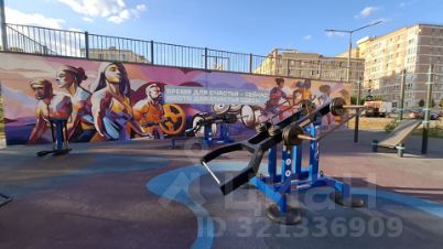 Придомовая территория : многоуровневое озеленение с прогулочными дорожками, зоны отдыха, спортивные площадки для разных возрастов, детские площадки, футбольное поле, волейбольная и баскетбольная площадки, тренажеры