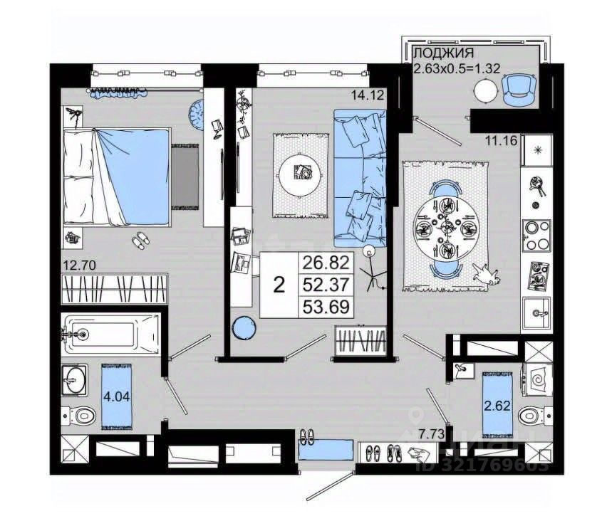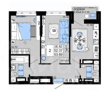 Двухкомнатная квартира площадью 53,7 кв.м расположена на 15 этаже современного жилого комплекса.