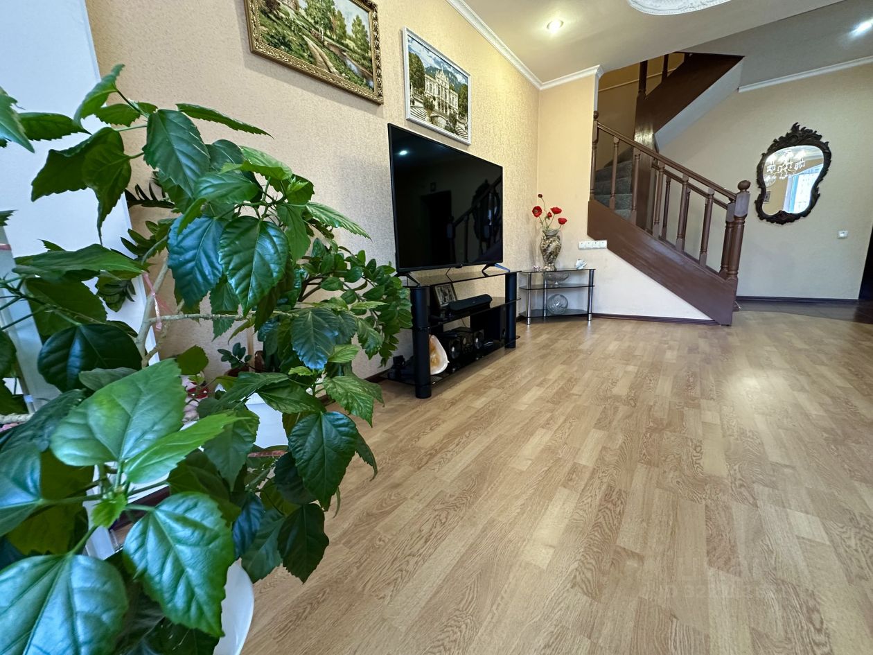На первом этаже огромная кухня - гостиная, гостевой санузел, балкон, гардеробная,