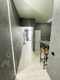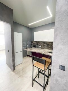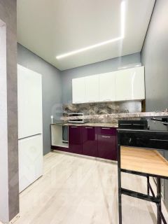 Компактная кухня оснащена всем необходимым: кухонный гарнитур, барный столик со стульями, бытовая техника.