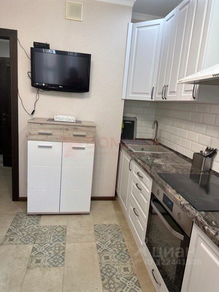 В гостиной диван, встроенная гардеробная. В кухне качественный гарнитур укомплектованный всей необходимой мебелью и бытовой техникой. Выход на балкон с кухни, установлено освещение. Ванная комната совмещенная с с/у выложенная керамогранитом. В квартире напольное покрытие ламинат, в кухне и прихожей керамогранит. Потолки натяжные. Дорогие обои, качественная сантехника.