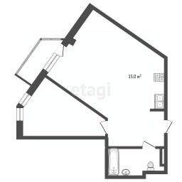 Общая площадь квартиры составляет 59.5 кв. м, кухня радует просторными 15 кв. м.