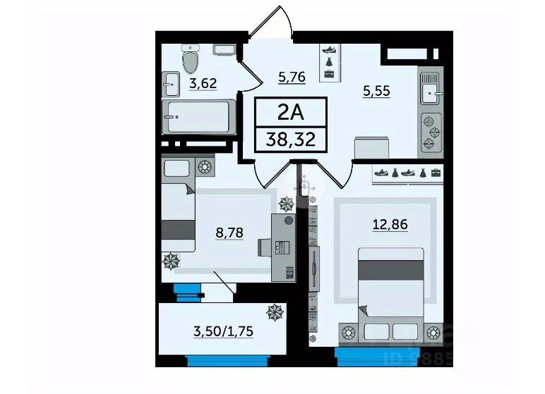 38,32 м². Просторные изолированные комнаты 12,86 м² и 8,78 м².