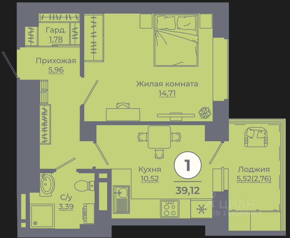 Общая площадь39,08 м²