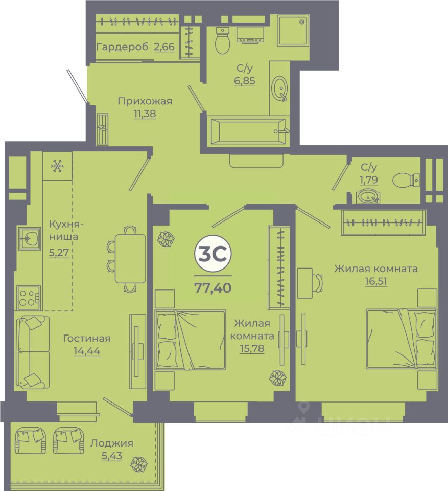 Общая площадь77,4 м²