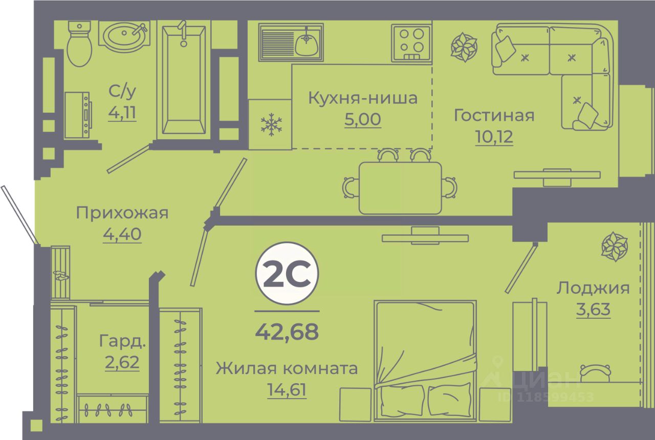 Общая площадь42,38 м²