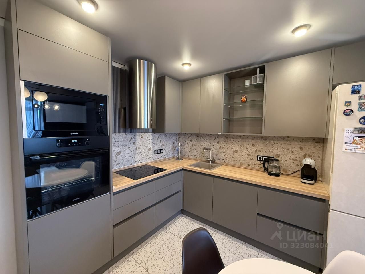 Кухня-гостиная (27 м²): серый встроенный гарнитур, вся техника хороших брендов Gorenje, Bosch: варочная панель, духовой шкаф, вытяжка, СВЧ.