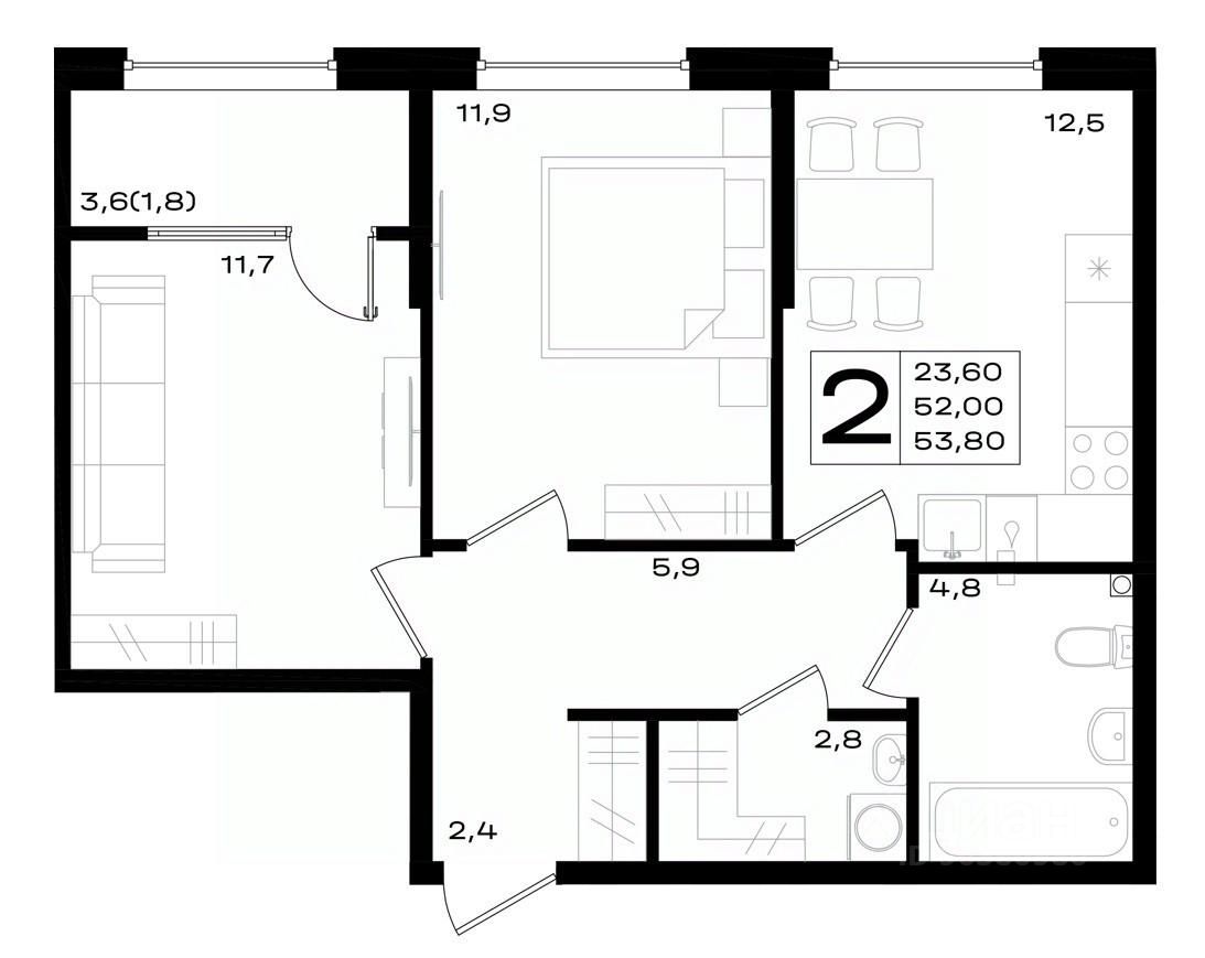 53,8 м²