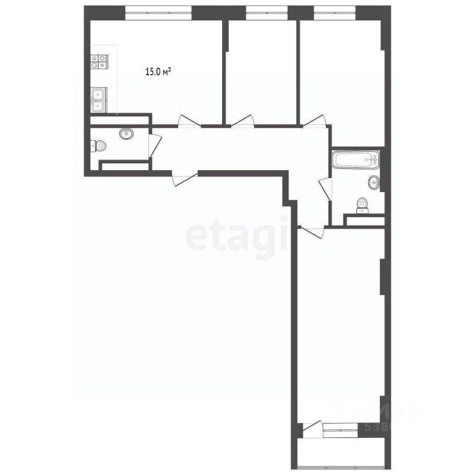 Общая площадь квартиры составляет 77 кв.м, 15 кв.м кухня-гостинная, 3 раздельные комнаты с просторной планировкой, 2 санузла, с возможностью создания отдельной зоны (мастер-спальни).