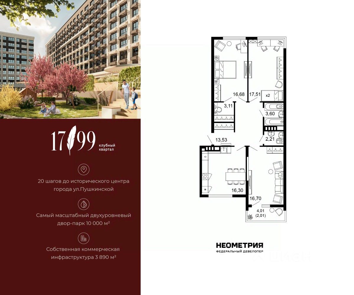 Продается квартира в клубном квартале "1799". Это истинный бизнес-класс в историческом центре Ростова. Особое сочетание уникальной локации и среды, где хочется создавать ту жизнь, которая подходит вам. Где каждое мгновение становится частью семейной коллекции лучших моментов. Квартал вдохновлен идеями великих и создан для великих. Образ хранителя ценностей — в каждой детали: имя и философия замедления, аристократичные фасады, лобби и холлы, семейные резиденции-истории и актуальное содержание. На приватной территории в 2,5 гектара четыре дома всего 10-этажей образуют масштабный двухуровневый двор-парк 10 000 м2 со smart-зонированием по возрастам и интересам. Среда квартала продумана для всей семьи: учебы и работы, спорта и отдыха, совместного досуга и теплых бесед. Гамак мечтателя, тайные места и маршруты, вертикальный сад пряных трав, амфитеатр и даже новогодняя ель. Резидентам доступны редкие для центра привилегии — природная тишина и свобода быть собой. Безукоризненный сервис и собственная коммерческая инфраструктура 3 890 м2, где все необходимое под рукой, позволяют жить в центре с бескомпромиссным комфортом.