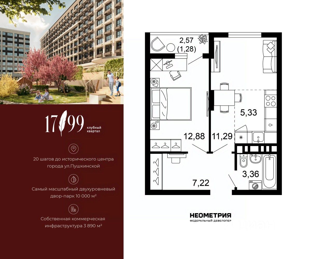 Продается квартира в клубном квартале "1799". Это истинный бизнес-класс в историческом центре Ростова. Особое сочетание уникальной локации и среды, где хочется создавать ту жизнь, которая подходит вам. Где каждое мгновение становится частью семейной коллекции лучших моментов. Квартал вдохновлен идеями великих и создан для великих. Образ хранителя ценностей — в каждой детали: имя и философия замедления, аристократичные фасады, лобби и холлы, семейные резиденции-истории и актуальное содержание. На приватной территории в 2,5 гектара четыре дома всего 10-этажей образуют масштабный двухуровневый двор-парк 10 000 м2 со smart-зонированием по возрастам и интересам. Среда квартала продумана для всей семьи: учебы и работы, спорта и отдыха, совместного досуга и теплых бесед. Гамак мечтателя, тайные места и маршруты, вертикальный сад пряных трав, амфитеатр и даже новогодняя ель. Резидентам доступны редкие для центра привилегии — природная тишина и свобода быть собой. Безукоризненный сервис и собственная коммерческая инфраструктура 3 890 м2, где все необходимое под рукой, позволяют жить в центре с бескомпромиссным комфортом.