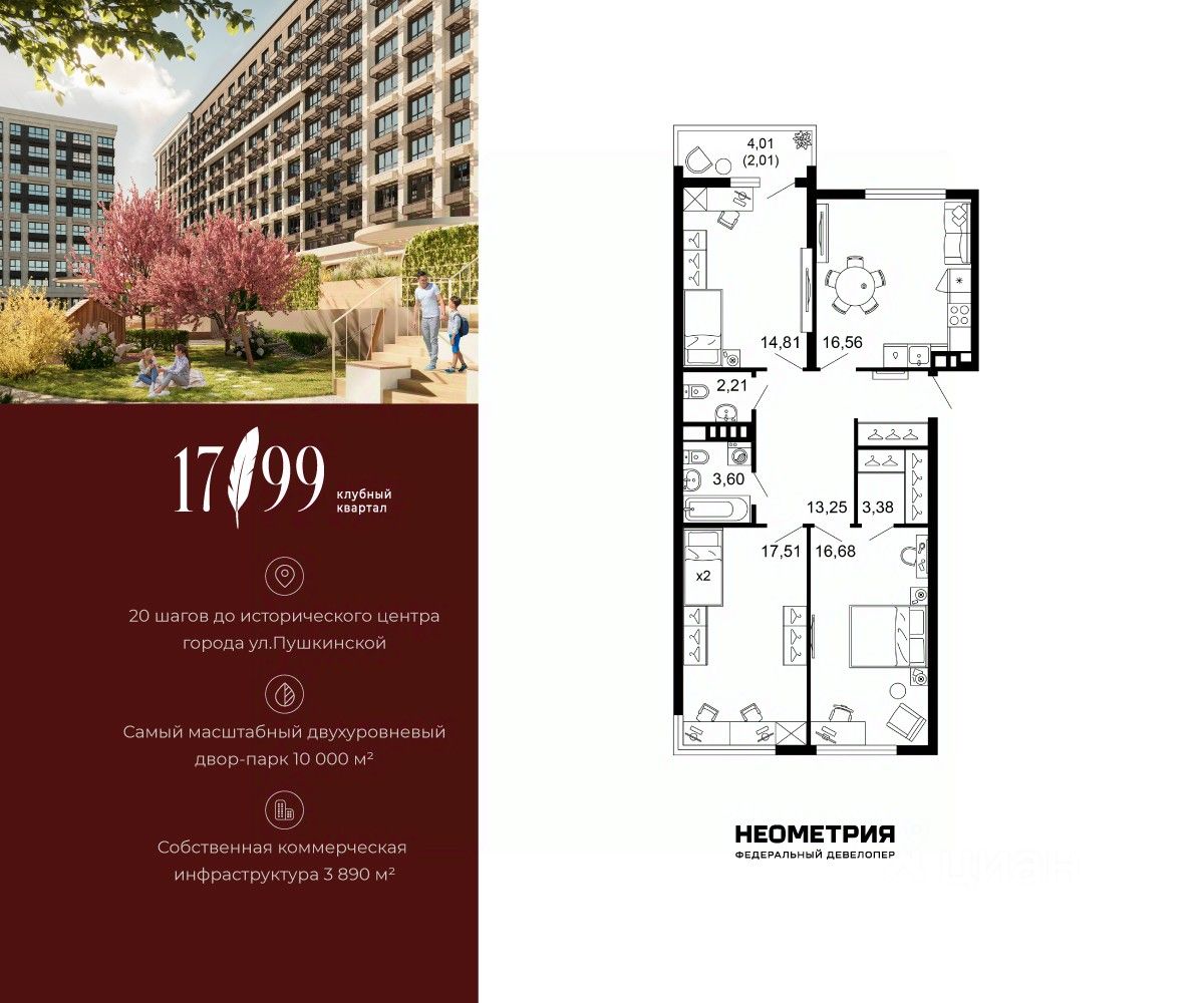 Продается квартира в клубном квартале "1799". Это истинный бизнес-класс в историческом центре Ростова. Особое сочетание уникальной локации и среды, где хочется создавать ту жизнь, которая подходит вам. Где каждое мгновение становится частью семейной коллекции лучших моментов. Квартал вдохновлен идеями великих и создан для великих. Образ хранителя ценностей — в каждой детали: имя и философия замедления, аристократичные фасады, лобби и холлы, семейные резиденции-истории и актуальное содержание. На приватной территории в 2,5 гектара четыре дома всего 10-этажей образуют масштабный двухуровневый двор-парк 10 000 м2 со smart-зонированием по возрастам и интересам. Среда квартала продумана для всей семьи: учебы и работы, спорта и отдыха, совместного досуга и теплых бесед. Гамак мечтателя, тайные места и маршруты, вертикальный сад пряных трав, амфитеатр и даже новогодняя ель. Резидентам доступны редкие для центра привилегии — природная тишина и свобода быть собой. Безукоризненный сервис и собственная коммерческая инфраструктура 3 890 м2, где все необходимое под рукой, позволяют жить в центре с бескомпромиссным комфортом.