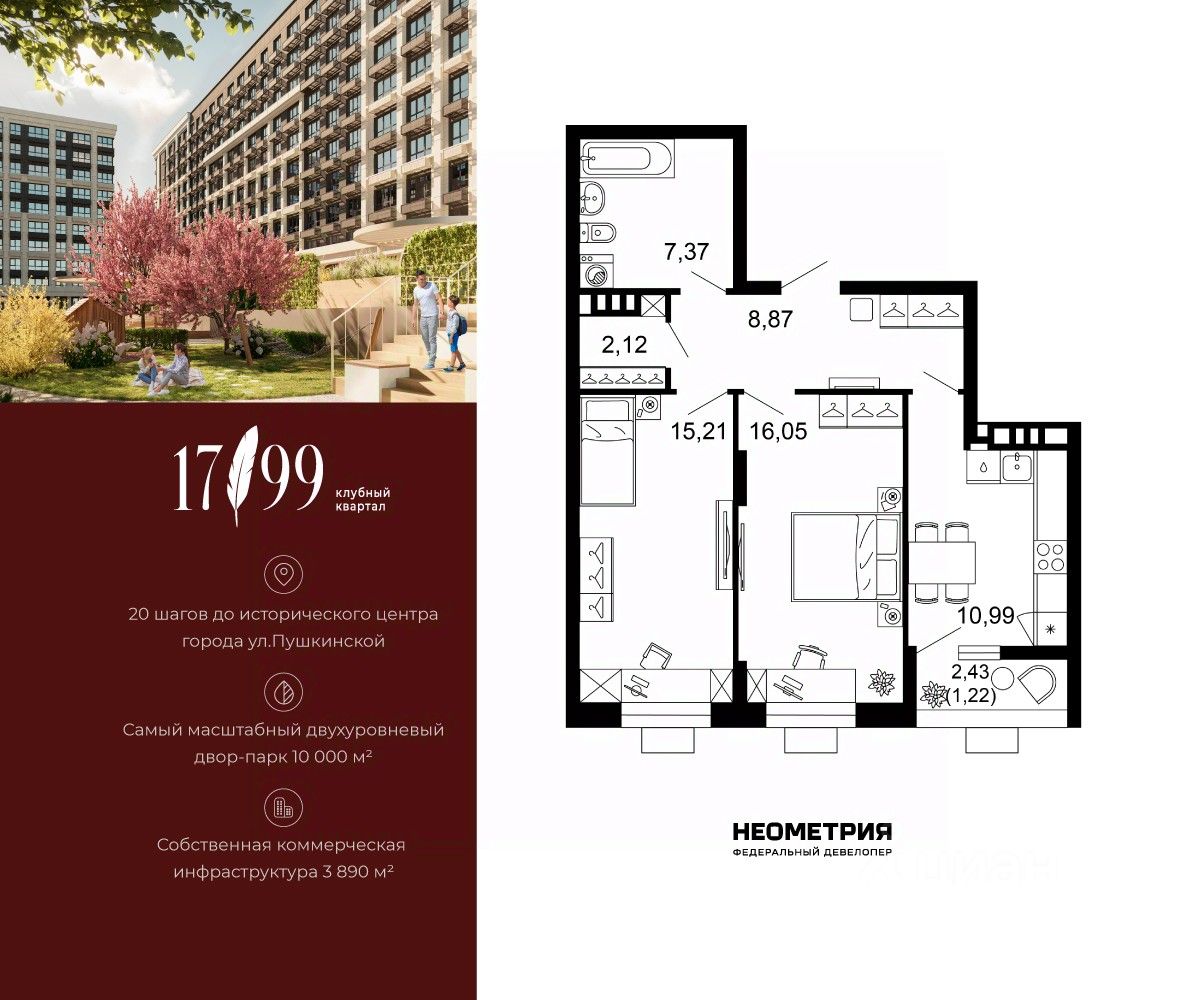 Продается квартира в клубном квартале "1799". Это истинный бизнес-класс в историческом центре Ростова. Особое сочетание уникальной локации и среды, где хочется создавать ту жизнь, которая подходит вам. Где каждое мгновение становится частью семейной коллекции лучших моментов. Квартал вдохновлен идеями великих и создан для великих. Образ хранителя ценностей — в каждой детали: имя и философия замедления, аристократичные фасады, лобби и холлы, семейные резиденции-истории и актуальное содержание. На приватной территории в 2,5 гектара четыре дома всего 10-этажей образуют масштабный двухуровневый двор-парк 10 000 м2 со smart-зонированием по возрастам и интересам. Среда квартала продумана для всей семьи: учебы и работы, спорта и отдыха, совместного досуга и теплых бесед. Гамак мечтателя, тайные места и маршруты, вертикальный сад пряных трав, амфитеатр и даже новогодняя ель. Резидентам доступны редкие для центра привилегии — природная тишина и свобода быть собой. Безукоризненный сервис и собственная коммерческая инфраструктура 3 890 м2, где все необходимое под рукой, позволяют жить в центре с бескомпромиссным комфортом.