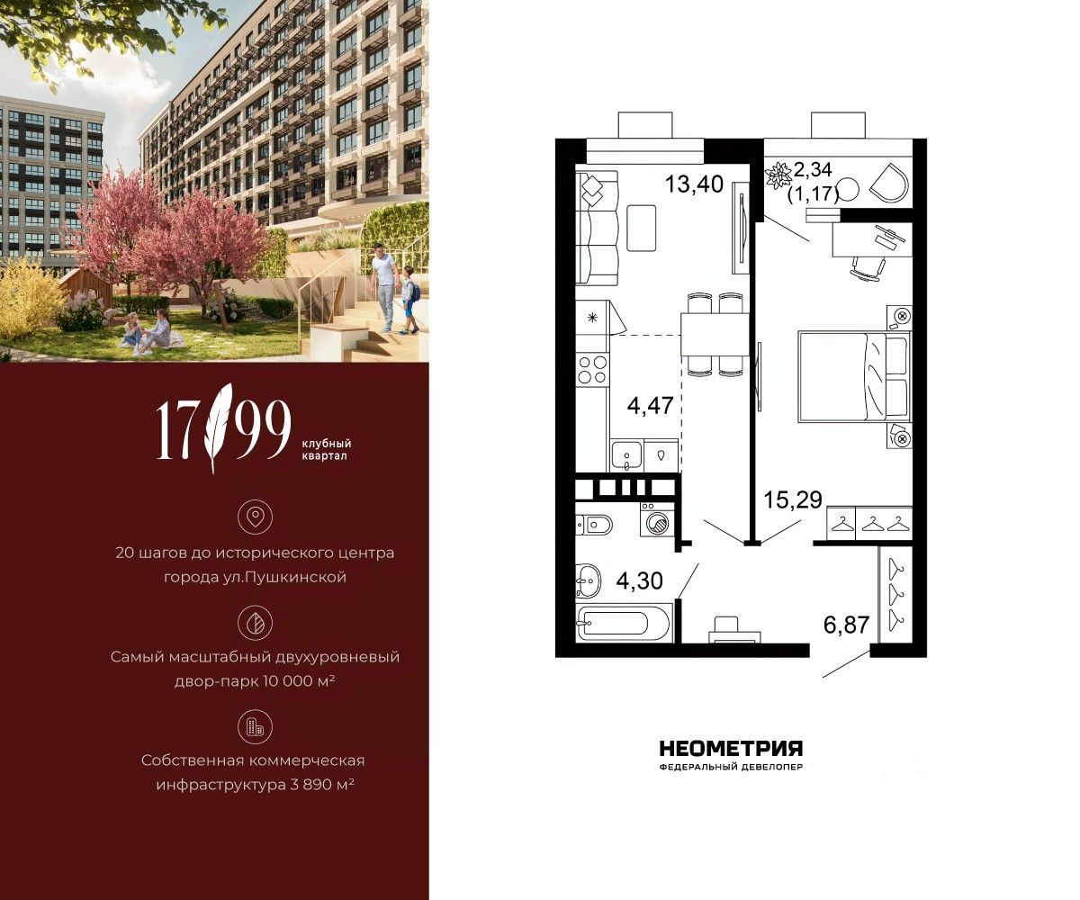 Продается квартира в клубном квартале "1799". Это истинный бизнес-класс в историческом центре Ростова. Особое сочетание уникальной локации и среды, где хочется создавать ту жизнь, которая подходит вам. Где каждое мгновение становится частью семейной коллекции лучших моментов. Квартал вдохновлен идеями великих и создан для великих. Образ хранителя ценностей — в каждой детали: имя и философия замедления, аристократичные фасады, лобби и холлы, семейные резиденции-истории и актуальное содержание. На приватной территории в 2,5 гектара четыре дома всего 10-этажей образуют масштабный двухуровневый двор-парк 10 000 м2 со smart-зонированием по возрастам и интересам. Среда квартала продумана для всей семьи: учебы и работы, спорта и отдыха, совместного досуга и теплых бесед. Гамак мечтателя, тайные места и маршруты, вертикальный сад пряных трав, амфитеатр и даже новогодняя ель. Резидентам доступны редкие для центра привилегии — природная тишина и свобода быть собой. Безукоризненный сервис и собственная коммерческая инфраструктура 3 890 м2, где все необходимое под рукой, позволяют жить в центре с бескомпромиссным комфортом.