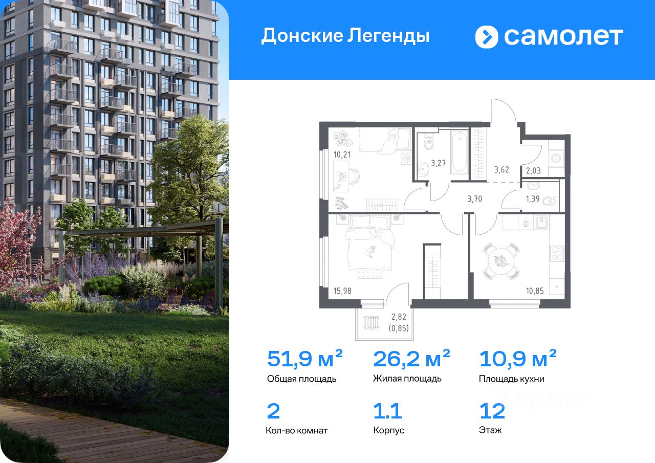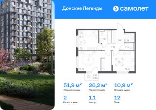 Строим кварталы для жизни с заботой о будущем. Предлагается 2-комнатная квартира комфорт-класса 51,9 кв.м в корпусе 1.1 на 12 этаже, в ЖК "Донские Легенды"