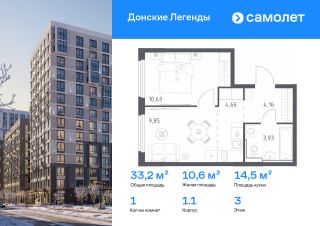 Строим кварталы для жизни с заботой о будущем. Предлагается 1-комнатная квартира комфорт-класса 33,23 кв.м в корпусе 1.1 на 3 этаже, в ЖК "Донские Легенды"